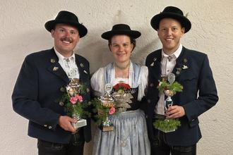 Strahlende Gesichter bei den Siegern: Bei Vereinspreisplatteln des GTEV Nußdorf siegte bei den Aktiven Buam Andreas Niederbuchner (links) und bei den Aktiven Dirndl seine Schwester Christina. In der Altersklasse heißt der Sieger wie im Vorjahr Tobias Purzeller (rechts).