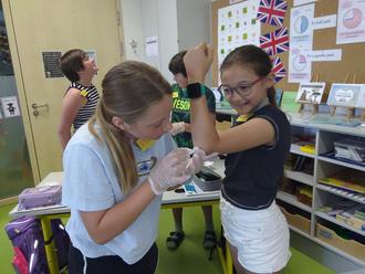 Neben dem sicheren Verpflastern, den verschiedensten Verbandarten, Hilfe bei Verbrennungen, Bandagieren eines gebrochenen Armes etc., wurden auch die Schonhaltung bei Schmerzen, das richtige Lagern, der Notruf und die stabile Seitenlage von jedem Kind mehrfach trainiert.