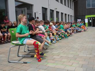 Bunte, tanzende Socken – mit dem Sockentanz nach dem Elvis-Hit „Be bop a lula“ begeisterten die Buben und Mädchen der 2. Klasse beim Sommerfest der Nußdorfer Grundschule.