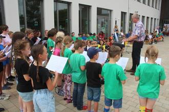 Der Schulchor unter der Leitung von Stephan Wahl sang unter anderem „Das alte Haus von Rocky Docky“, womit die neue Nußdorfer Grundschule aber nicht gemeint sein kann.