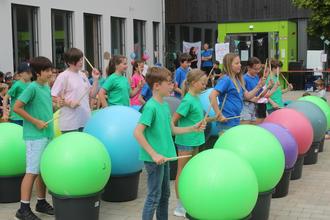 Mit einem fetzigen Trommelwirbel auf Pezzibällen und einem gleichzeitigen Tanz um die Bälle herum, erfreute die 4. Klasse das Publikum.