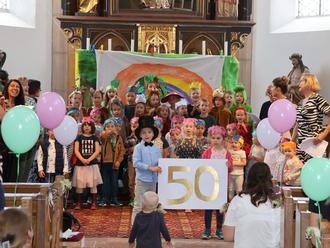 "Stark wie ein Baum" - unter diesem Motto stand die Feier zum 50. Geburtstag des Pfarrkindergartens St. Laurentius Nußdorf und auch der bunte und fröhliche Gottesdienst zu Beginn.