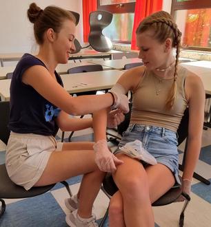 Erste-Hilfe-Ausbildung am Isinger Gymnasium: Miriam Brühwiler legt Luisa Fiala einen Druckverband an