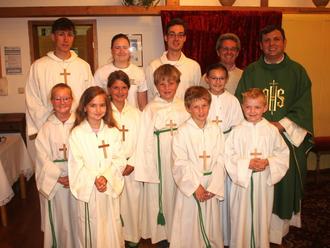 Einen kleinen Wehrmutstropfen gab es beim feierlichen Einführungsgottesdienst auch. Drei „Große“ aus der Ministrantenschar beendeten ihren Dienst und wurden verabschiedet. Für die Jahre als Ministrant bedankte sich Pater Marius bei Theresa Klaus, Lea Rauth und Mona Höllthaler. Er überreichte den Drei ein Geschenk und sprach die Hoffnung aus, dass sie Verbindung zur Ministrantengruppe halten und die Zeit in bester Erinnerung behalten. pv.