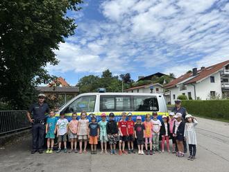 Am 16. Juli besuchte die Polizei die Vorschulkinder für ein Schulweg-Sicherheitstraining. Zuerst ging es um die allgemeinen Aufgaben der Polizei und die Uniform und Ausrüstung, z. B. Handschellen. Danach sind die Polizisten gemeinsam mit den Vorschulkindern bis zur Nußdorfer Feuerwehr gegangen, haben die Straßenüberquerung geübt und auf dem Weg auf alle Gefahren aufmerksam gemacht nach dem Motto „Sicher zur Schule“. Zum Abschluss durften alle ins Polizeiauto einsteigen, bei der Abfahrt der Polizisten ertönte auch das Martinshorn.