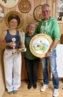 Auf dem Bild: v. l. Magdalena Walter mit den Pokalen, Schützenmeisterin Marlene Tögel und Lutz Siersleben mit der Anfangsscheibe