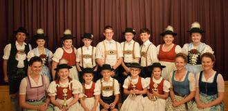 Zum Gruppenbild stellten sich die 13 Nußdorfer Buam und Dirndl der Kinder- und Jugendgruppe nach Ende des Gaujugendpreisplatteln mit Dirndldrahn auf, gemeinsam mit Jugendleiter Lorenz Pöschl (links) und dem Jugendleiterteam. Die drei Pokalgewinnerinnen sind Hanna Wimmer (vordere Reihe, 2.von links) sowie Lena Flassak und Katharina Gschwendner (vordere Reihe, 2. und 3. von rechts).