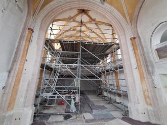 Seit Anfang Juni, als die Renovierungsarbeiten begannen, sieht es in dem mehr als 530 Jahre alten Kirchengebäude alles andere als einladend aus. Der Innenraum ist eine Baustelle und kaum mehr als Kirche zu erkennen. Das Langhaus ist bis unter die Decke eingerüstet, weil die Malereien an der Decke von Kirchenmaler Daniel Braun restauriert werden. An den Seitenwänden wurde der Putz im Sockelbereich bis auf rund eineinhalb Meter Höhe abgeschlagen, um die Wände trocken zu legen und Salpeter zu entfernen. Mittlerweile sind die Wände aber schon wieder verputzt. Alle elektrischen Leitungen wurden erneuert, wozu Schlitze ins Mauerwerk geschlagen werden mussten und im Altarraum wurden Steinplatten aus- und wieder eingebaut. Der Marmorbelag auf der Treppe zur Empore wurde – weil teilweise zerbrochen – entfernt. Die Treppe ist neu betoniert und zuvor wurden die Stufenhöhen korrigiert. Die Treppenstufen werden neu mit Holztritten belegt. Auch die Handläufe werden erneuert.