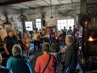 Die Hammerschmiede in der Tittmoninger Straße ist die älteste noch voll im Betrieb stehende Hammerschmiede Europas. In der Hammerschmiede wurden schon im Mittelalter die Waffen für die Herzöge geschmiedet, und auch heute noch ist sie im Einsatz, wenn für das große Mittelalterfest in Burghausen Waffen und Gerätschaften benötigt werden. Der Schmied führte die Sänger und Sängerinnen in die Thematik des Schmiedens ein, indem er die vier Elemente, die beim Schmieden wichtig sind, in Beziehung zueinander brachte. Das Wasser, das die Mühlräder und die Hämmer antreibt; das Feuer, das das Eisen nur mit Hilfe der Luft zum Glühen bringt und die Erde, die mit der Steinkohle das Eisen auf Temperaturen über 1500 Grad bringt. Humorvoll und gewürzt mit 56%igen Schmiedefeuer ließ der Schmied den Hammer sausen und einige ‚Mutige‘ die schweren Schmiedehämmer schwingen. Die vielen Fragen der Besucher erläuterte er mit viel Freude und Geduld. Im kleinen Shop, der zum Schmiedegelände gehört, deckte sich so mancher Reisende mit ‚Schmiedefeuer‘ ein.