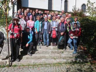 Das Foto zeigt die Fußwallfahrergruppe vor der Kirche Maria Eck.