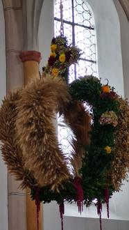 Beim Erntedankgottesdienst wurde zwar die schöne Kirchendekoration gelobt, es ist aber kaum jemandem aufgefallen, dass wir auch eine neue, verkleinerte Erntekrone haben!