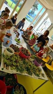 Zu Beginn gab es nach der Ansprache der Schulleiterin Frau Neumayr-Scherl eine Andacht, bei der Herr Kohl auf die Wichtigkeit des Kirchweihfestes und die Bedeutung der Fahne „Zachäus“ verwies. Danach durften die Kinder der 4. Klasse zuerst zum „Oimnussn-Bacha“ in die Küche. Dort zeigten die Ortsbäuerinnen Frau Steiner, Frau Huber und Frau Steiner, wie der Teig hergestellt und wie die leckeren Oimnussn gebacken werden. Zusätzlich konnten die Kinder noch tolle Zierkürbisse mit Trockenblumen verzieren, die sie mit nach Hause nehmen durften. Die Kürbisse waren eine großzügige Spende von Familie Gschwendner. Frau Schroll und Frau Gschwendner erklärten sich zudem noch bereit, mit allen Kindern die schönen Kürbisse zu basteln.
