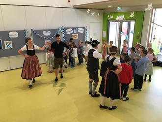 Als letzte Station durften die Kinder den bayrischen Volkstanz mit dem Trachtenverein üben. Zuerst stellten die Damen und Herren des Trachtenvereins die Tracht vor und erklärten dann das Dirndldrahn und das Platteln. Alle probierten es aus und es war ganz schön schwer! Zuletzt durften alle Kinder noch miteinander im Kreis tanzen. Natürlich nahmen alle Klassen am Brauchtumstag teil, durchliefen aber die Stationen in einer anderen Reihenfolge.