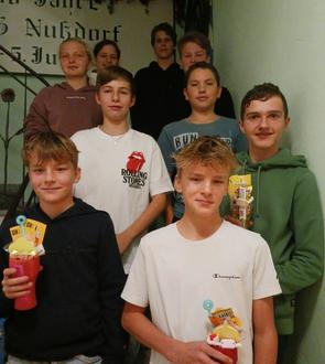 Das gleiche wurde dann auch für die acht Luftgewehrjugendlichen durchgeführt. Nur wurden nicht die erzielten Ringe multipliziert, sondern dividiert. Somit kam auf den ersten Platz Jakob Schmid vor seinen Bruder Lorenz Schmid. Den dritten Platz belegte Kilian Rächl. Die drei Besten freuten sich über einen kleinen Preis und wünschten sich eine baldige Wiederholung vom lustigen Preisschießen.