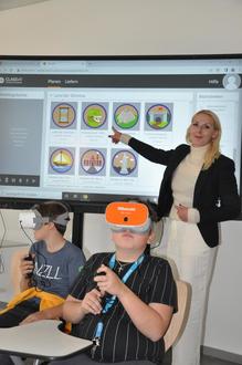 Die Isinger Siebtklässler Claudius Weinfurtner und Chris Wagner sind mit ihren neuen VR-Brillen schon in einer virtuellen Welt unterwegs – in der Zeit der Dinosaurier, wie Schulleiterin Catrin Brandl zeigt.