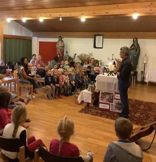 Zu Erntedank fand im Nußdorfer Kindergarten eine kleine Andacht mit Michael Kohl im Pfarrsaal statt, der zur Zeit als Kirche genutzt wird und festlich mit Blumen, Obst und Gemüse geschmückt war. Die Kindergartenkinder und großen Krippenkinder sangen, sprachen Gebete und überlegten gemeinsam, wofür man dankbar sein kann.
