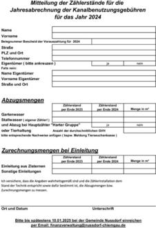Das Formblatt zur Mitteilung der Zählerstände für die Jahresabrechnung der Kanalbenutzungsgebühren für das Jahr 2024 finden Sie auf der nächsten Seite zum heraustrennen.