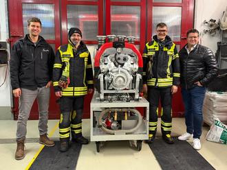 Peter Sedlmayr (von links) von der Herstellerfirma Ziegler übergab die neue Tragkraftspitze an die Kommandanten Andreas Götzinger und Tobias Wimmer, sowie an Bürgermeister Toni Wimmer.