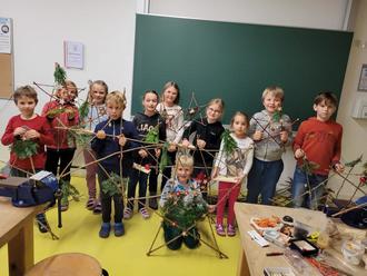 Sehr weihnachtlich wurde es beim Basteln vom Kinderprogramm des Gartenbauvereins. 12 Kinder und fünf Helferinnen vom Verein trafen sich dazu im Werkraum der Grundschule. Gebastelt wurde ein Stern aus Zweigen. Mit den mitgebrachten Ruten von Haselnuss, Hartriegel und Weide wurde zuerst ein 5-zackiger Stern gebunden, was gar nicht so einfach war. Aber mit Hilfe der Erwachsenen hatte dann doch jedes Kind einen kleineren oder relativ großen Stern vor sich. Der musste jetzt noch mit Kugeln, Tannen- und Zedernzweigen und anderen Dekoartikeln verziert werden. Dabei hatten die Kinder am meißten Spass und super Ideen. Wer wollte, konnte auch noch einen zweiten Stern basteln, oder sich Apfelsaft und Lebkuchen schmecken lassen. So verging die Zeit schnell und die Kinder wurden nach einer Stunde wieder abgeholt.