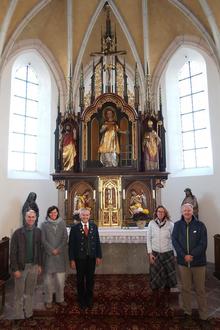 Über das gelungene Ergebnis der Renovierung des Hochaltars freuen sich: v.l.n.r. Daniel und Petra Braun (Restaurator/in), Josef Brunner (Mesner), Sandra Bertl (Verwaltungsleiterin), Peter Höfeler (Kirchenpfleger)