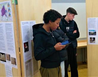 Die Zehntklässler Salem Akwa und Tom Dvanajscak studieren die Isinger Ausstellung zur deutsch-französischen Freundschaft