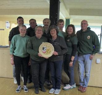 Schützenmeisterin Pia Oberkandler und Schützenmeisterin Marlene Tögel bei der Übergabe der Wanderscheibe sowie die Gewinner der Preise.