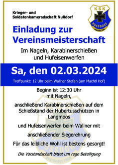 Die Vereinsmeisterschaft der Krieger- und Soldatenkameradschaft (KSK) wird am Samstag, 2. März als Dreikampf mit den Disziplinen Nageln, Karabinerschießen und Hufeisenwerfen ausgetragen.