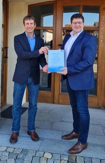 v.l.: Claus Hofmann (Beauftragter für Informationssicherheit) übergibt die Urkunde des LSI-Siegels an Bürgermeister Toni Wimmer