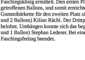 wurden sie von den Jugendleitern nochmals in die Handhabung des Blasrohrs eingewiesen. Der Spaß war groß, als sie damit auf eine Wand mit vielen bunten Luftballons zielen durften. Jeder hatte 3 „Schuß“. Die Anzahl der getroffenen Ballons wurde dann mit dem Ringergebnis multipliziert. So wurde der Faschingskönig ermittelt. Den ersten Platz belegte mit 104 Ringen und 2 getroffenen Ballons, und somit erreichten 208 Punkten, Quirin Kunz. Die Gummibärkette für den zweiten Platz sicherte sich mit 170 Punkten (85 Ringe und 2 Ballons) Kilian Rächl. Der Drittplatzierte wurde mit einer Guatlkette belohnt. Umhängen konnte sich das begehrte Teil mit 118 Punkten (118 Ringe und 1 Ballon) Stephan Lederer. Bei einem gemütlichen Würstlessen wurde der Faschingsfreitag beendet.