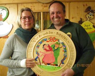Das Er & Sie Schießen bei der Nußdorfer Schützengesellschaft war wieder ein großes Vergnügen. Heuer waren 12 Paare am Start. Jeder Teilnehmer absolvierte 10 Schuss auf eine ungewöhnliche Scheibe. Die Besonderheit war, dass sich der 10er nicht in der Mitte, sondern weiter außen befand. In der Mitte wurden 0 Ringe erzielt. Auch die restliche Ringaufteilung war nicht in der gewohnten Reihenfolge. So war die erzielte Ringzahl für jeden eine große Überraschung. Anschließend wurde noch mit 3 Dartpfeilen auf eine am Boden liegende Dartsscheibe gezielt. Die beiden Ergebnisse wurden zusammengefasst und anschließend mit der erreichten Punktzahl des Partners addiert. Dabei belegten Katrin Neubert und Robert Wölfle mit 242 Punkten den ersten Platz und konnten die Er & Sie Wanderscheibe heuer gewinnen. Den zweiten Platz belegten Anni und Willi Kecht mit 206 Punkten, vor den drittplatzierten Wolfgang Stöger mit seiner Sie „Hermann“ Tontsch mit 191 Punkten. Alle Teilnehmer konnten sich abschließend aus liebevoll zusammengestellten Preisen etwas aussuchen.