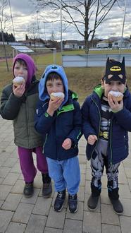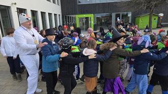 Gut gelaunt zog die Schulgemeinschaft dann mit einem langen Polonaisetanz in den Pausenhof und verabschiedete die Vorschulkinder durch einen gemeinsam gebildeten Tunnel. Nun wurde noch zu den Klassenvorführungen kräftig mitgetanzt und gesungen. Die von Herrn Bürgermeister Toni Wimmer spendierten Krapfen bildeten schließlich den krönenden Abschluss eines lustigen Faschingvormittags!