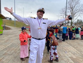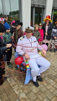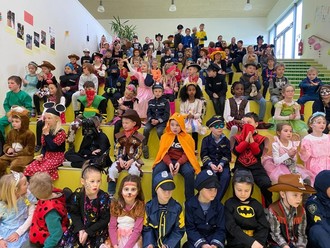 Dort boten die 4. und die 2. Klasse drei Faschingstrommelzüge dar. Danach fesselten vier Kinder den Bürgermeister an einen Stuhl. Nach einigen Verhandlungen konnte sich Herr Wimmer glücklicherweise mit Krapfen für die gesamte Schulfamilie als Lösegeld befreien. Frisch gestärkt tanzten und feierten alle Schüler zu lustiger Musik und Herr Wimmer war für jeden Spaß zu haben!