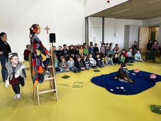 Am 26. Februar wurde der Mehrzweckraum der Grundschule in eine Theaterbühne verwandelt, denn die Kinderoper Papageno aus Wien brachte gemeinsam mit den Schulkindern das Musikstück „Peter und der Wolf“ von Sergej Prokofjew zur Aufführung. Schon im Vorfeld wurden die Schüler im Unterricht auf dieses Ereignis vorbereitet. Einige Zweit-, Dritt- und Viertklässler studierten fleißig kurze Dialoge für die Rollen von Peter, Großvater, Vogel, Ente und Katze ein.