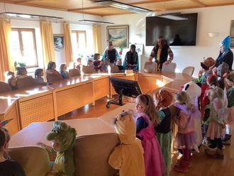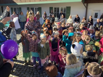 Am Donnerstag überraschten die Kinder und Erzieherinnen den Bürgermeister im Rathaus. Auch Toni Wimmer musste „schwere“ Aufgaben bewältigen und mittanzen. Anschließend ging es weiter ins Selbertingerheim, wo sich die Bewohner sehr über den spontanen Besuch freuten. Auf dem Weg nach Hause schauten alle noch bei Czogi’s Dorfladen vorbei. Hier gab es für die Kinder süße Gummischlangen.