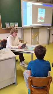 Sie las den Kindern der 1. und 2. Klasse und nach der Pause den Großen zwei Schulstunden lang Geschichten aus ihren Büchern „Max, zefix!“ und „Max räumt zamm“ (Volk Verlag) vor.