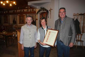 Christa Osenstätter, die 16 Jahre 1. Vorsitzende des Gartenbauverein Nußdorf war, wurde bei der Jahreshauptversammlung zur Ehrenvorsitzenden ernannt. Die Ernennungsurkunde wurde von den beiden Vorsitzenden Martin Baierl (rechts) und Sepp Brunner (links) überreicht.