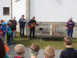 Beim Kinderkreuzweg in Nußdorf wurde auf vier Stationen dem Leiden und Sterben Jesu gedacht. Die Osterkerze aus dem Vorjahr, die Jesus Christus symbolisierte und ein Kreuz wurden bei der Prozession mitgetragen.