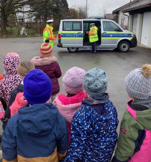 Nachdem alle Kinder sicher die Straße überquert hatten, ging es wieder zurück in den Kindergarten. Hier verabschiedeten sich die Polizisten mit Blaulicht und Martinshorn.