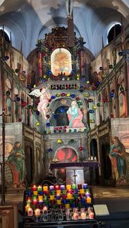 Am 20. 03.2025 unternahmen wir mit den Senioren der Gemeinde und unseren Mesner einen Ausflug nach Aschau. Wir fuhren ins Café König und nahmen anschließend an einer Führung in der Kirche teil. Die Kirche selbst faszinierte mit ihrer barocken Architektur und den kunstvollen Verzierungen. Besonders schön war das Heilige Grab, das als Nachbildung des Grabes Christi dient und eine lange Tradition in der kirchlichen Passionsgeschichte hat. Das Aschauer Heilige Grab beeindruckt nicht nur durch die über 150 Glas-Kugeln, die es schmücken und beleuchten, sondern auch durch zahlreiche weitere einzigartige Details. Diese Besonderheiten machen das Grab zu einer bedeutenden Sehenswürdigkeit, die weit über die Region hinaus beeindruckt. Zum Abschluss der Führung leuchtenten die rund 150 mit gefärbtem Wasser gefüllten Glaskugeln. Es war ein wunderschöner Ausflug für uns alle. C.K.