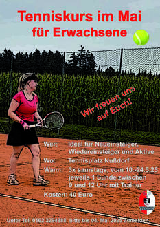 Um Kinder/Jugendliche wieder mehr für den Tennissport zu begeistern, führten wir ein Schnuppertraining der 3./4. Klasse der Grundschule durch. Wir boten auch einen Tenniskurs für Erwachsene an.