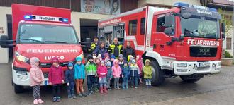 Am Montag, den 24.04.23 durften die Kindergarten- und Krippenkinder die Feuerwehr Nußdorf besuchen. Christian Roppert und Sepp Steiner erklärten den Kindern die wichtigsten Aufgaben der Feuerwehr und wie sich die Kinder bei einem Brand verhalten sollen, und sie stellten ihr Maskottchen "Grisu" vor. Außerdem zeigten sie den Kindern ihre feuerfeste Schutzkleidung.