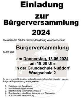 Falls Sie Themenwünsche oder Fragen für die Bürgerversammlung haben, bitten wir Sie, diese vorab schriftlich oder per E-Mail (info@nussdorf-chiemgau.de) bei der Gemeinde bis zum Mittwoch, den 29.05.2024 einzureichen.