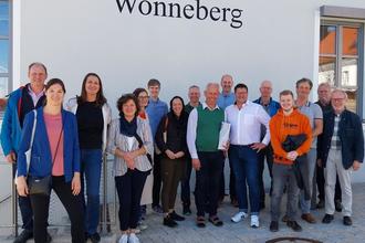 Bürgerrat und Gemeinderat auf Exkursion. Wonnebergs Bürgermeister Martin Fenninger (Mitte, grüner Pullover) stellte das Wonneberger Bürgerhaus und die Neugestaltung der Dorfmitte vor.
