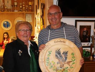 Franz Huber (re.) gewann zum Saisonabschluss das Endschießen der Schützengesellschaft Nußdorf. Die Endscheibe, in die Hubers Name noch eingraviert wird, überreichte Schützenmeisterin Marlene Tögel.