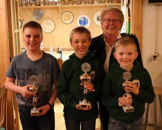 Bei den Jüngsten, der Lichtgewehrjugend, holte sich beim Endschießen Moritz Karl (mitte) den Sieg, vor Sebastian Steiner (links) und Florian Lackner (rechts). Überreicht wurden die Siegerpreise von Schützenmeisterin Marlene Tögel.