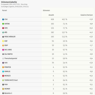 hiermit möchten wir Sie über die Ergebnisse der Europawahl am 09.06.2024 in der Gemeinde Neuching informieren. Die Wahlbeteiligung lag bei 70,5%.