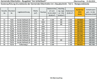 Der aktuelle durchschnittliche Verkehrswert inkl. Erschließungskosten für Bauland in Ottenhofen (vgl. 1.6 der Richtlinien vom 26.04.2022) zum Zeitpunkt der Vergabe ist ebenfalls aus der beigefügten Tabelle ersichtlich.