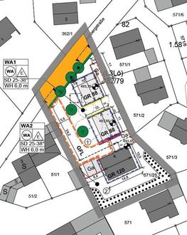 Das bislang nur mit einem Einzelhaus bebaute Grundstück soll nach Wunsch des Grundstückseigentümers mit zwei weiteren Einzelhäusern nachverdichtet werden. Je Gebäude (inkl. Bestandsgebäude) sollen 2 Wohneinheiten zugelassen werden, davon je eine Wohneinheit als Einliegerwohnung. Die Geschossigkeit soll bei E+I+D liegen.