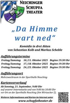 Auf geht’s zum Neichinger Schupfatheater! In diesem Jahr spielen wir das Stück „Da Himme wart ned“. Eine Komödie in drei Akten von Sebastian Kolb und Markus Scheble.