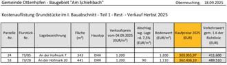 Der Verkehrswert der Grundstücke vom 04.09.2025 inkl. Erschließungskosten für Bauland in Ottenhofen (vgl. 1.6 der Richtlinien vom 26.04.2022) zum Zeitpunkt der Vergabe ist ebenfalls aus der beigefügten Tabelle ersichtlich.